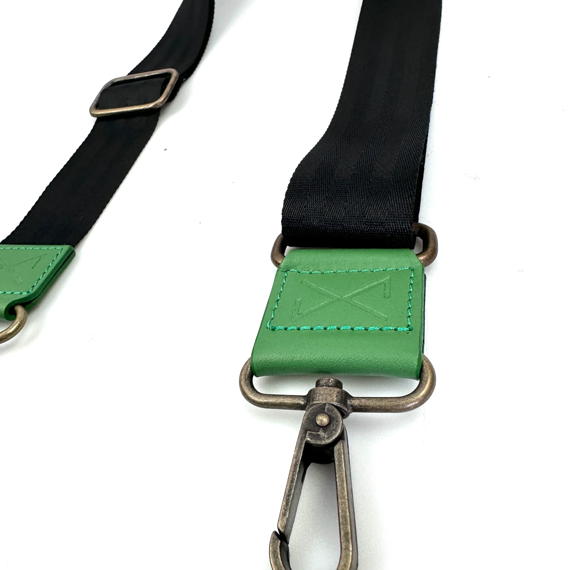 Bandolera para bolsos, en cinta de poliester reciclado, con las puntas acabadas en piel, lujadas y grabadas con nuestro anagrama.